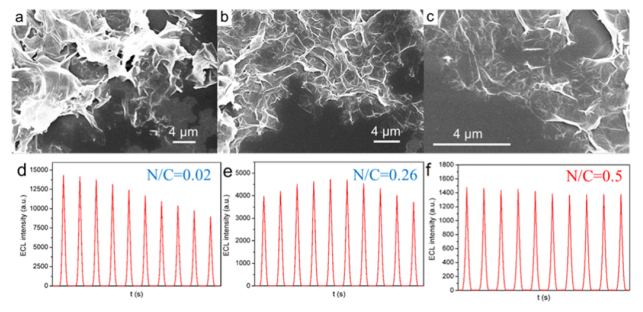Figure 3.NCM在不同N/C比(摩爾比)時(shí)的SEM圖像,及PNC/NCM對(duì)應(yīng)的ECL響應(yīng)。(a-c) SEM圖像和(d - f) 在含有10 mM TPrA的乙腈中的ECL響應(yīng)。