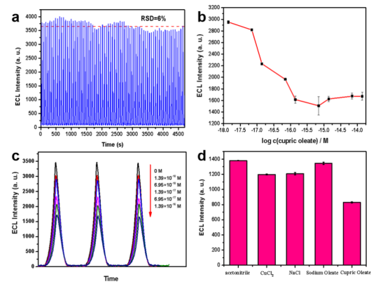 Figure 5. (a)穩(wěn)定的ECL信號(hào)輸出超過1小時(shí),RSD為6%。(b)不同油酸銅濃度下CsPbBr