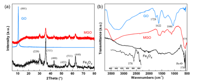 4和MGO的XRD譜圖,(b) FTIR譜圖。