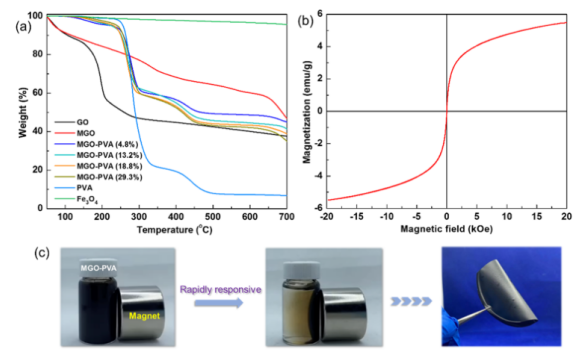 4、MGO、PVA、MGO−PVA復合膜的TGA曲線。(b) MGO−PVA (18.8 wt %)復合膜的磁化曲線。(c) MGO−PVA混合物的快速磁性組裝(通過磁性組裝工藝制備的折疊MGO−PVA的光學圖像,證實了復合膜的韌性)。