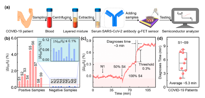 -1)水平。g- FET經(jīng)過spike S1蛋白修飾,SARS-CoV-2抗體生物識別事件發(fā)生在石墨烯表面附近,100 μL全血清LoD為150個抗體,這是抗體檢測LoD的最低值。檢測臨床血清樣本的診斷時間縮短至2分鐘。因此,g-FET快速和精確的SARS-CoV-2篩查,在未來預防和控制其他疫情暴發(fā)方面也有很大的希望。