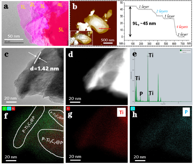 2@P的薄層結構,(d) STEM-HAADF圖像,(e) TEM-EDX光譜,(f -h) P-Ti
