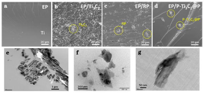 2納米復合材料。P元素通過共價鍵與基質緊密連接,提高了RP在存儲和使用期間的安全性問題。由于MXenes的多面體特性,納米復合材料具有廣泛的應用前景。作為環氧樹脂的阻燃劑,有效地減少了火災的發生。一步剝離形成的納米復合材料的制備為MXenes的實際應用提供了更可行的途徑。