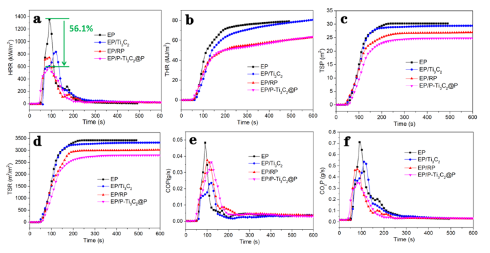 圖6 (a) EP及其復合材料的HRR曲線,(b) THR曲線,(c) TSP曲線,(d) TSR曲線,(e) COP曲線,(f) CO2P曲線(填料添加量為2 wt %)。
