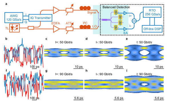 圖4. 平衡檢測測試。(a)平衡檢測的測量裝置。AWG:任意波形發生器,TL:可調諧激光器,EDFA:摻鉺光纖放大器,PC:偏振控制器,ATT:光衰減器,EA:電放大器,RTO:實時示波器。(b,f) (b)50Gbit/s和(f)90Gbit/s BPSK信號的實時信號波形(藍線代表I+分支,紅線代表I−分支)。(c-e) (c)I+分支,(d)I−分支以及(e)平衡檢測的50 Gbit/s BPSK眼圖。(g–i) (g)I+分支,(h)I−分支以及(i)平衡檢測的90 Gbit/s BPSK眼圖。
