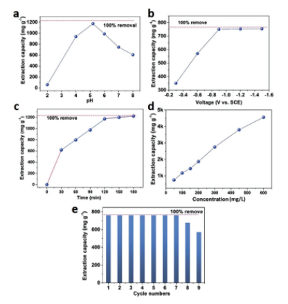 Figure 2. 不同條件下的提取性能:a-d) pH,外加電壓,時間,以及濃度的影響。e)50毫克每升鈾時,提取鈾的循環性能。