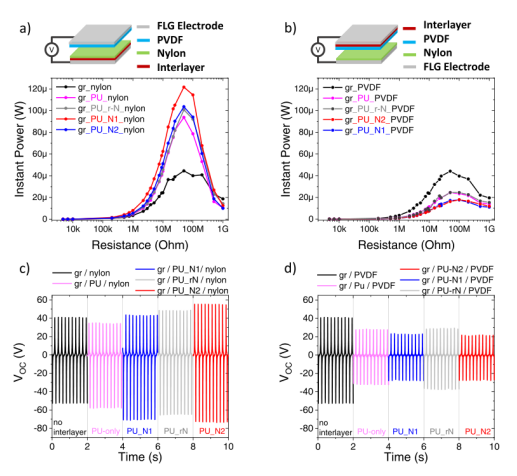 圖4. 兩種設備配置的TENGs瞬時輸出功率測量:a)和c)在正摩擦材料(尼龍)( FLG/ PU_X/nylon // PVDF/FLG)的界面上引入功能性Pu夾層;RMS功率:6.95 μW, PU_N1;8.25µW PU_N2;6.45µW, PU_r-N;6.3µW ,PU-only;無夾層的TENGs為5µW。b)和d)在與負摩擦材料(PVDF) (FLG/nylon // PVDF/PU_X/ FLG)的界面處引入夾層。c)和d)達到V