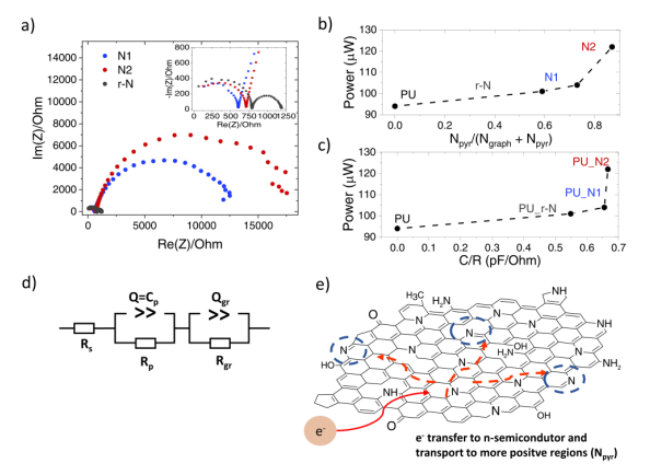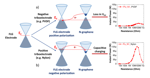 收集所有可獲得的清潔能源是一項重要戰略,有助于消除目前對不可再生能源的依賴。近年來,摩擦電納米發電機作為一種新型的機械能收集器受到人們的關注,它是電池的有效替代品,尤其適用于便攜式設備。在這里,通過加入氮摻雜石墨烯(N-石墨烯),增加了少層石墨烯基電極的電容,使TENGs的輸出功率提高了3倍。研究了不同類型N-石墨烯的電子性質、摻雜濃度以及N-吡啶和N-石墨位的相對含量對TENGs性能的影響。這些位點具有不同的電子親和力,并協同作用于N-石墨烯的電容性和電阻性的變化,從而影響TENG性能。結果表明,當N-石墨烯(一個N-半導體)與正摩擦電材料和電極界面接觸時,TENG的功率增強,而當它與負摩擦電材料界面接觸時,觀察到電性能下降。這種行為可以用N-石墨烯的量子電容對電極化學勢的依賴來解釋,其通過在摩擦生電時在兩個電極上產生的相反極化而移動。