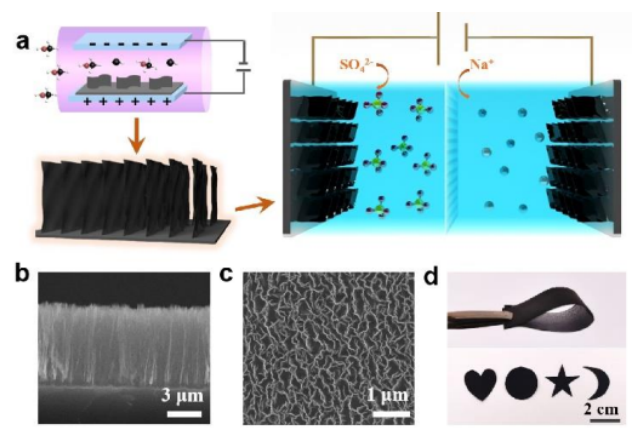 Figure 1. 電極材料的合成工藝和形貌表征。a EF-PECVD過程生長SVGA的示意圖,和構建基于 SVGA 的 EC 裝置示意圖。b、c SVGA 的橫截面和俯視SEM 圖像。d 柔性和可加工性SVGAs 電極的數碼照片。