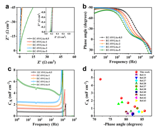 Figure 3.不同高度的SVGA基ECs 的電化學特性。a Nyquist 圖。b,c EC-SVGA 的 Φ 和 CA 與頻率的關系圖。d EC-SVGA 的 Φ 和 CA 與報道的值相比較。