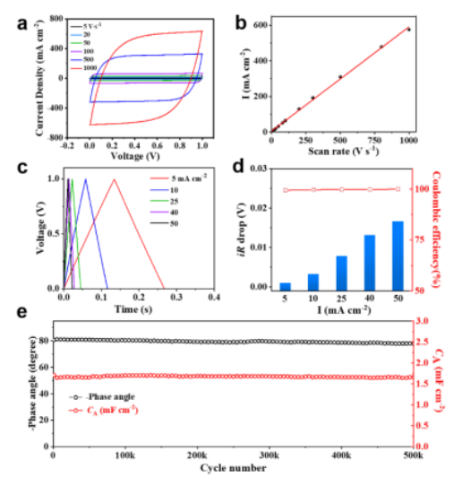 Figure 4.EC-SVGA-2的電化學性能。a EC-SVGA-2 在高掃描速率下(1000 V s-1)的CV 曲線。b 在0.5 V電壓下放電電流密度與掃描速率的關系。c 在不同電流密度下的恒電流充放電曲線。d 電壓降和庫侖效率。e EC-SVGA-2的循環穩定性評估。