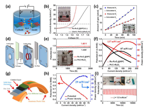 Figure 5.a)水電解槽示意圖。b)在0.1 M KOH電解液中測試的LSV極化曲線。c)產O2和H2的法拉第效率。d)水溶液中鋅-空氣電池的原理圖示意圖。e)自制鋅空氣電池的開路電位和f)放電極化曲線和相應的功率圖。g) 柔性固態可充電鋅空氣電池示意圖,以及相應的h)極化和功率密度曲線。i) 充放電電壓曲線。