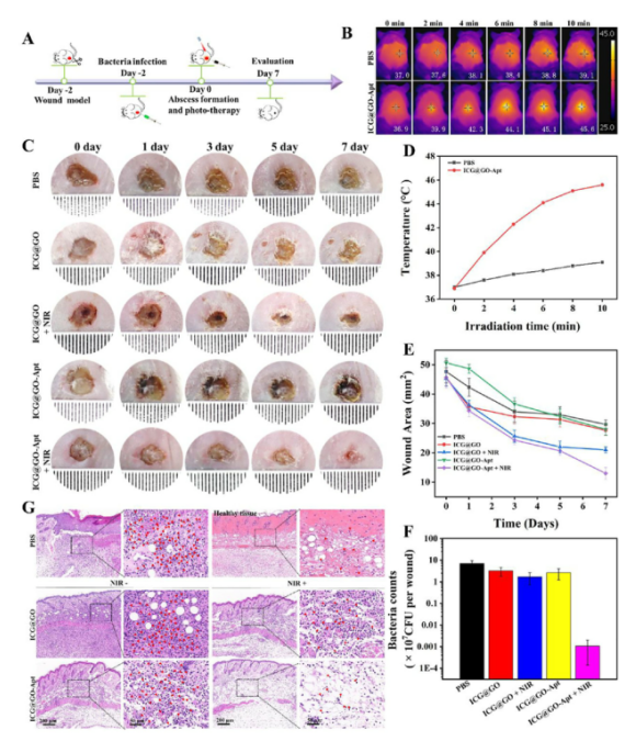 圖 7. ICG@GO-Apt NSs 對鼠傷寒沙門氏菌病灶感染的體內(nèi)治療效果。(A) 體內(nèi)皮膚傷口感染模型的建立和治療示意圖。 (B,C) 實時熱成像圖像和相應(yīng)的光熱加熱曲線。 (D、E) 傷口愈合過程中感染傷口的圖片和相應(yīng)傷口面積的定量分析(0、1、3、5 和 7 天)。 (F) 在不同處理后的第七天,細菌對受感染的組織進行計數(shù)。(G) 各種處理后感染部位的蘇木精和伊紅染色圖像。