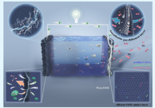 -轉移途徑(n = 3.2-3.5)。 這些數據證明,在發生 ORR 的 NGA-5/SM 中可以自然形成三相邊界。 更重要的是,這項工作提供了一個概念證明,即可以通過兩步制備方法用高效 NGA 制備無 Pt 空氣陰極,以實現 1593 mW m