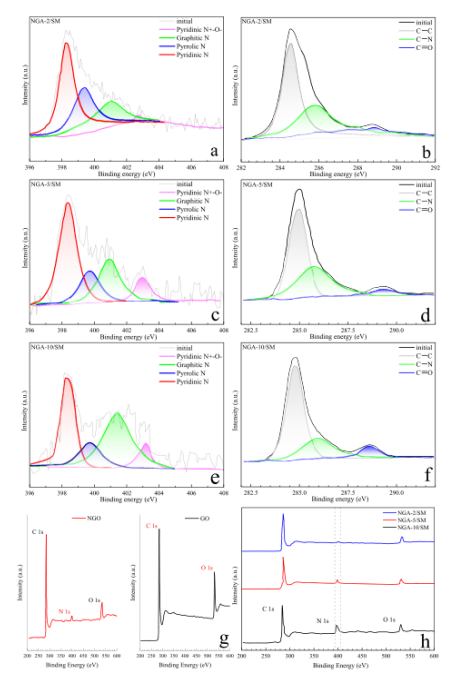 圖 3. NGA-x/SM 的 XPS 光譜,(a-c)高分辨率N 1s光譜揭示了N-堿基組的存在,包括吡啶-N、吡咯-N、石墨-N 和吡啶 N+-O- 。 ( d-f) C 1s光譜由 C-C/C=C (284.5 eV)、C-N (286.6 eV)和O-C=O (289.0 eV) 組成。 (g) 根據XPS光譜NGO(左)和GO(右)。推測氨更傾向與GO的缺陷反應以促進熱處理過程中吡啶-N 的形成。這種獨特的以吡啶氮為主的摻雜和豐富的缺陷有望對 ORR/OER過程做出巨大貢獻。 (h) XPS測量光譜,顯示C、N 和O峰的存在。