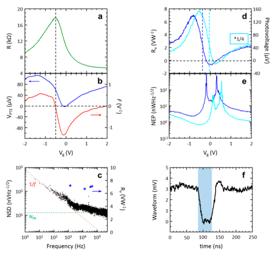 bu)之間的差值獲得,乘以△Te = 1k。Sbg根據(jù)GFET跨導計算,使用莫特方程。Sbu假設等于Sbg在Vg= 0 V。右縱軸,紅色曲線:場效應晶體管因子(F),根據(jù)GFET跨導計算。(c)單位帶寬的噪聲電壓(左縱軸,Vg= 0 V)。(d)空氣側左縱軸:用1.334kHz的調制頻率測量的太赫茲響應度。雙符號變化與PTE主導的反應兼容。右垂直軸:光從正面入射并通過硅透鏡襯底時測得的作為Vg函數(shù)的光電壓。改進的光學耦合將光響應提高了一個因子4。 (e)作為Vg函數(shù)的NEP。(f)黑色曲線:在負微分電阻狀態(tài)下驅動QCL時記錄的光電壓時間軌跡。從波形中,我們提取出τ~6±0.3 ns。藍色陰影區(qū)域代表激光發(fā)射關閉的時間間隔。