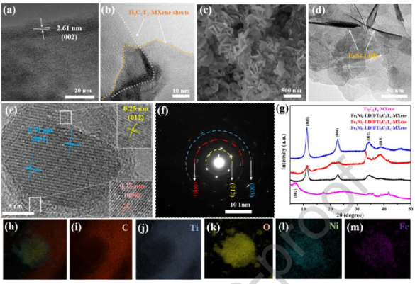 x-MXene納米雜化物的SEM和(d) TEM圖像。 (e)高分辨圖像。(f) SAED形象。(g) x射線衍射模式。(h-m) FeNi-LDH/Ti