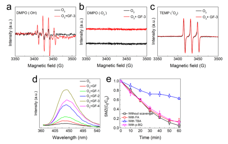 圖 4. 使用 DMPO 作為捕集劑在 (a) 超純水和 (b) 無(wú)水甲醇中進(jìn)行的 EPR 光譜。 (c) 使用 TEMP 作為捕集劑在超純水中進(jìn)行的 EPR 光譜。 (d)與有缺陷的石墨烯在用臭氧鼓泡 30 分鐘后產(chǎn)生的•OH 量相關(guān)的熒光發(fā)射強(qiáng)度峰。(e)淬滅劑對(duì) SMZ 降解的影響。
