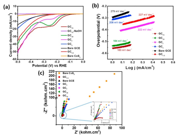 2/石墨烯氣凝膠雜化樣品在酸性溶液中表現出極低的過電位(160 mV vs.RHE)和HER高電流密度。活性的增強可歸因于石墨烯氣凝膠的活性電化學表面積的增加和石墨烯三維基體內的多面顆粒。此外,CoS