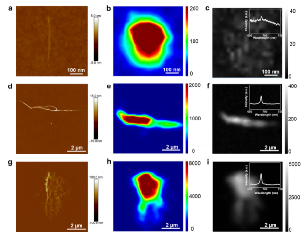 圖 2. GNR的AFM、拉曼和光致發(fā)光映射。 單層 GNR 的(a) AFM、(b) 拉曼和 (c)光致發(fā)光映射。100-GNR束的(d) AFM、(e) 拉曼和 (f)光致發(fā)光映射。 1000-GNRs 簇的(g) AFM、(h) 拉曼和 (i)光致發(fā)光映射。拉曼和光致發(fā)光映射分別基于D峰(1350 cm