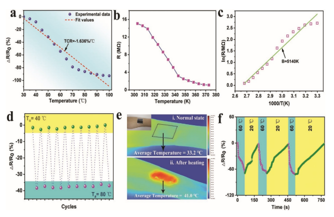 Figure 5. XSBR/SSCNT-5的溫度傳感性能。a) XSBR/SSCNT-5在溫度從30℃升高到100℃時的歸一化相對電阻變化。b) XSBR/SSCNT-5電阻隨溫度的變化呈非線性關系。c) Arrhenius圖顯示ln(R)與1000/T呈線性關系。d)傳感器在40 ~ 80℃反復冷卻和加熱過程中具有重復性的溫度識別能力。e)正常狀態下及置于熱水瓶(60℃)10s . f后前臂皮膚溫度的紅外熱圖像。熱敏傳感器對熱(60℃)和冷(20℃)水的瞬時電響應。
