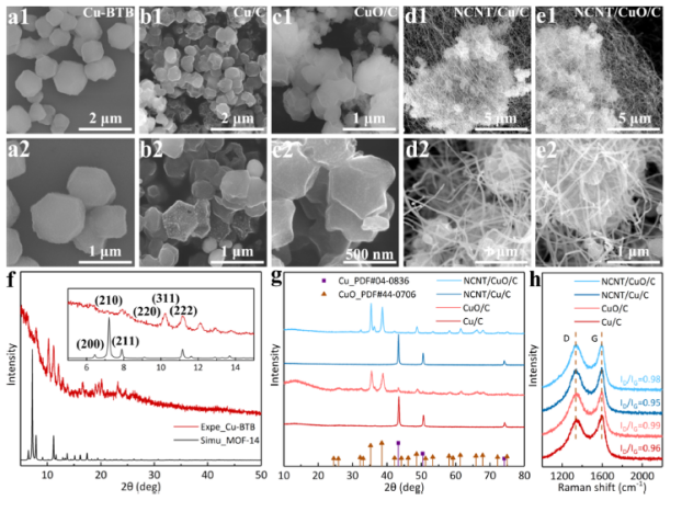 圖3 (a1, a2) Cu- BTB, (b1, b2) Cu/C, (c1, c2) CuO/C, (d1, d2) NCNT/Cu/C, (e1, e2) NCNT/CuO/C的SEM圖像;(f)合成和模擬的Cu-BTB的XRD譜圖;(g) PXRD;(h)MOF衍生的納米材料的拉曼光譜。
