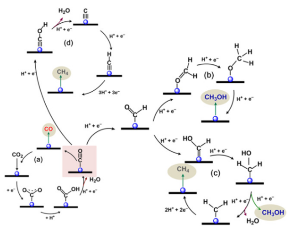 Figure 3.電化學CO2還原框架。CoTPP/MWCNT對 (a) CO, (b) CH3OH, (c) CH4 和副產物 CH3OH, 和 (d) CH4的反應機理圖。