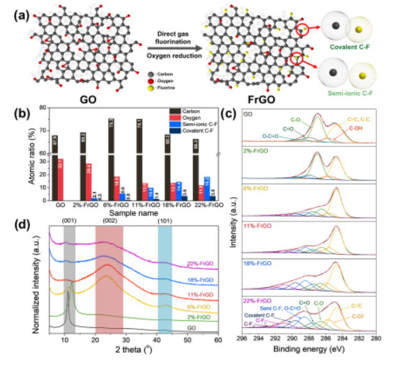 Figure 1.(a)通過直接氣體氟化合成FrGO的示意圖。( b )基于XPS數據分析的FrGO樣品中的原子比。(c) GO和FrGO樣品的 C 1s XPS光譜。(d) GO和 FrGO樣品的XRD衍射圖。