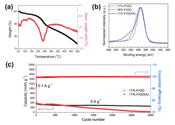 Figure 4.(a) 氮氣氣氛下18%-FrGO 的TGA 熱分析曲線。(b) 11%-FrGO、18%-FrGO和11%-FrGO(A)的F 1s XPS光譜。(c) 11%-FrGO 和11%-FrGO(A) 電極在5 A g-1 電流密度下循環3000次的循環穩定性。