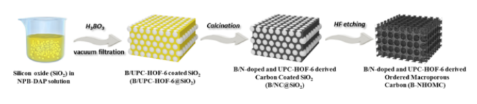 在清潔穩(wěn)定的前提下,提高燃料電池和金屬空氣電池電極反應中氧還原反應(ORR)的催化效率至關重要。大量研究表明,雜原子摻雜和結構優(yōu)化是有效的策略。這里,受研究的過渡金屬M-Nx位點啟發(fā),通過利用氫-鍵的有機框架作為碳和氮源,以及二氧化硅(SiO2)球作為模板,在有序大孔碳中設計了單原子狀的B?N