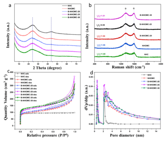 Figure 3.(a) PXRD圖,(B)Raman圖,(c)N2吸附-解吸等溫線,以及(d)NHC、NHOMC、B-NHOMC-20、B-NHOMC-25和B-NHOMC-30樣品的相應孔徑分布。