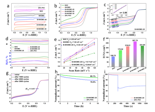 Figure 4.電化學性質表征。不同樣品的(a) N2-或O2飽和的0.1 M KOH中CV曲線,(b) LSV曲線,和(c)不同轉速下的LSV曲線(插圖:相應的K-L圖)。(d)不同樣品的過氧化物產率(H2O2%)和電子轉移數(shù)(n),(e)計算的掃描速率和電容電流密度的線性擬合曲線,和(f)對應的ECSA。(g)B-NHOMC-25電極在1000、2000和3000圈CV循環(huán)前后的LSV曲線對比。(h)計時電流響應。(i)甲醇耐受性評估。