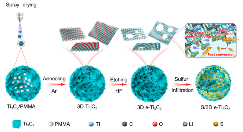 鋰硫電池因其理論能量密度高、成本低、生態友好等優點,在下一代電子產品領域具有廣闊的前景。然而,鋰硫電池的實際應用受到多硫化物穿梭效應和反應動力學遲緩的阻礙。采用噴霧干燥和化學蝕刻工藝制備了多級多孔MXene微球作為多功能硫電催化劑。相互連接的骨架提供了均勻的硫分布,防止了MXene薄片的重新堆積,而豐富的邊緣使類似納米片的Ti