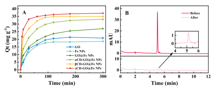 圖1 (A)不同復合材料OTC吸附量的時間變化規律;(B) OTC暴露于γCD-GO@Fe NPs 120分鐘前后的HPLC圖譜。