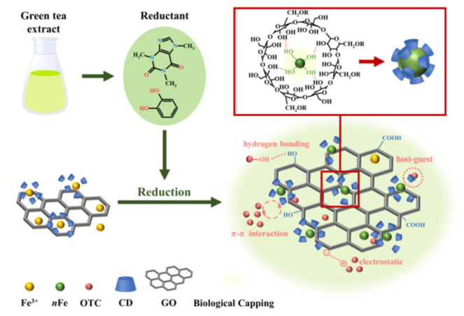 圖7 環糊精存在下綠茶生成GO@Fe NPs機制的示意圖。