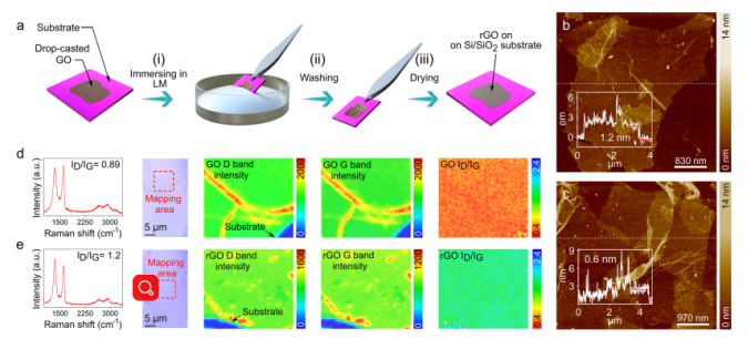 Figure 1. LM對GO單層的影響:(a)合成示意圖。(b-c)原子力顯微鏡(AFM)圖像和厚度分布。(d-e) Raman分析,D帶和G帶以及I