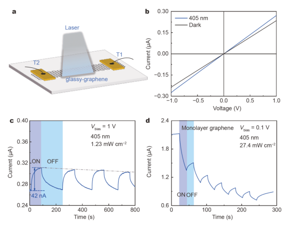 圖2. 與單層石墨烯光電探測器相比,幾層玻璃態石墨烯光電探測器的光響應性能結果。(a)照明下玻璃態石墨烯光電探測器的示意圖。(b)玻璃態石墨烯光電探測器在黑暗和405nm光照下的