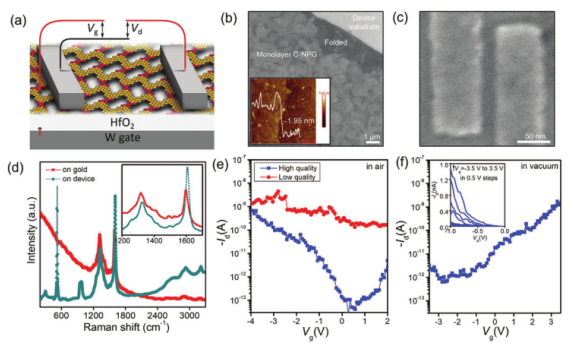 Figure 2. 器件結構、傳輸和電氣特性。a) 局部背柵 C-NPG FET 的器件結構示意圖。b) C-NPG 薄膜的SEM)圖像。c) C-NPG 器件的 SEM 圖像。d) 在Au上和器件上 C-NPG的拉曼光譜。e) 室溫 I
