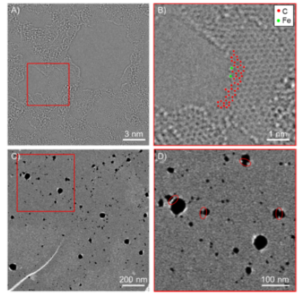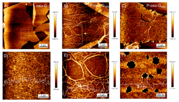 通過濕化學方法特定尺寸可控的刻蝕石墨烯基面仍然存在挑戰。這里,提出了一種簡便且可控的方法,制備了可溶液加工的多孔石墨烯衍生物。氧化石墨烯的衍生物,即氧官能化的石墨烯(oxo-G)被選作為前驅體,它具有可控的面內空位缺陷密度。隨后會產生羥基自由基,在oxo-G 基面內刻蝕孔,且優先從缺陷處開始刻蝕。因此,獲得的oxo-G可溶液加工薄片具有毫米橫向尺寸,和可調控的孔隙直徑( 在5 nm ~ 500 nm 之間)。此外,通過AFM、TEM、UV-vis 光譜、FTIR 光譜、XPS、固體NMR光譜和Raman光譜分析,提出了孔結構生長機制。羥基自由基與靠近缺陷位點的oxo-G之間的親電加成和氧化反應是蝕刻過程的基礎。該多孔石墨烯材料可用作膜材料或可調諧的二維材料。