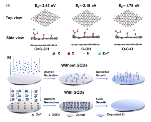 Figure 1. 不同氧官能團吸附Zn離子的計算模型及相應的結合能(a)。抑制枝晶生長的原理示意圖(b)。
