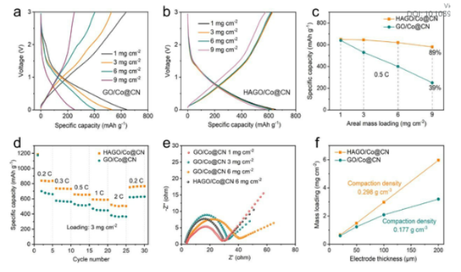 Figure 3. (a-b) 兩種電極的恒電流充放電曲線。(c)比容量保留率作為載量的函數。(d) 比較了倍率性能。(e) 電化學阻抗譜。(f)載量與電極厚度的關系。