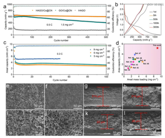 Figure 4. (a) 不同電極的長期循環性能。(b) 對應于長期循環穩定性的電壓曲線。(c) HAGO/Co@CN電極的面積容量。(d)面積容量比較。(e-f,i-j)循環前后的SEM圖。(g-h,k-I)循環前后的橫截面SEM圖。