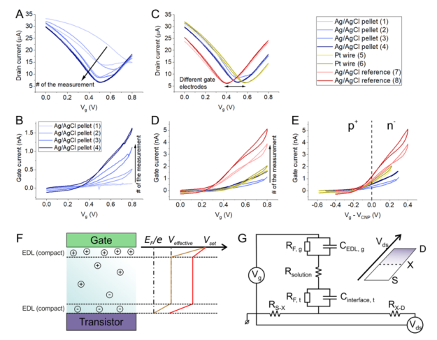歸一化柵極電流。(F)柵極-電解質(zhì)和晶體管-電解質(zhì)界面的示意圖。EDL-雙電層(致密層的位置用虛線表示)。V