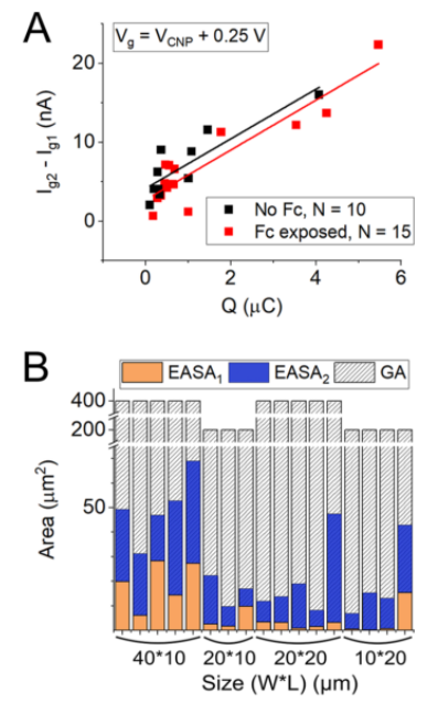 石墨烯場效應(yīng)晶體管廣泛用于生物傳感器的開發(fā)。然而,關(guān)于其功能細(xì)節(jié)的某些基本問題尚未完全理解。這些問題之一是電解質(zhì)門控配置中存在柵/漏電流。在這里,我們報告了我們對化學(xué)氣相沉積 (CVD) 生長的石墨烯的觀察結(jié)果和這種現(xiàn)象的原因。我們觀察到晶體管的柵極電流出現(xiàn)在暴露于電解質(zhì)的石墨烯表面。在場效應(yīng)測量中,當(dāng)石墨烯通道被空穴摻雜時,柵極電流是電容性的,而當(dāng)它被電子摻雜時,法拉第電流是電容性的。我們證明法拉第電流歸因于溶解在水溶液中的氧氣的減少,并且它們的大小隨著每次測量而增加。我們使用循環(huán)伏安法和氧化還原探針Fc(MeOH)