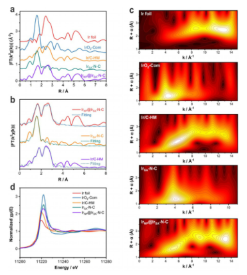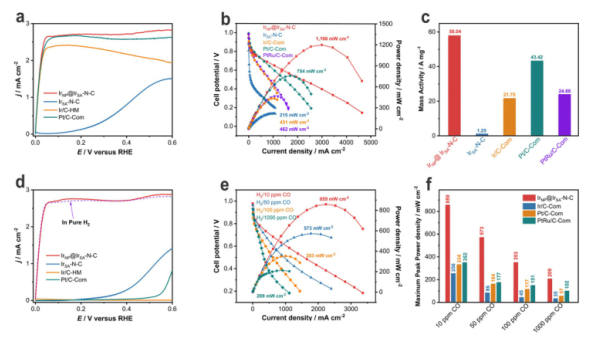 質子交換膜燃料電池(PEMFCs)對微量CO雜質極度敏感,因此對H2純度有嚴格的要求,并排除了直接使用廉價粗氫作為燃料的可能性。在此,報道了一項概念驗證研究,設計合成了由銥顆粒和銥單原子位點組成的新型催化劑,解決了CO中毒問題。研究發現,Ir單原子位點不僅是很好的CO氧化位點,而且可以有效清除吸附在Ir納米粒子附近的CO分子,從而使Ir納米粒子保留部分活性進行H2氧化。在PEMFCs中,Ir納米粒子和Ir單原子位點之間的相互作用,賦予了催化劑優異的H2氧化活性(1.19 Wcm-2),和優異的CO電氧化活性(85 mWcm -2);該催化劑在H2/CO混合氣體中還表現出良好的CO耐受性,比目前最好的PtRu/C催化劑好兩倍。