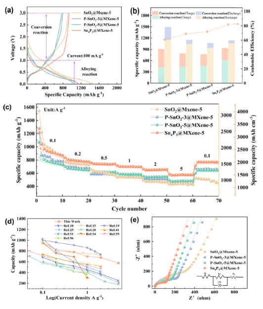 3納米粒子能夠在MXene層表面緊密錨定。sn4p3基納米復合材料具有較高的可逆容量,初始庫侖效率為82%,以及出色的速率性能(1519 mAh cm