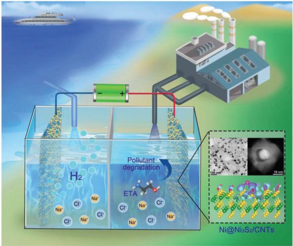 2/CNTs納米異質結構電極在鹽水中低能耗析氫(陰極)與電催化去除乙醇胺污染物(陽極)電池中的原理圖。