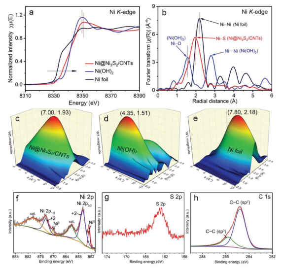 2/CNTs的Ni 2p、g) S 2p和h) C 1s信號的高分辨率XPS光譜。