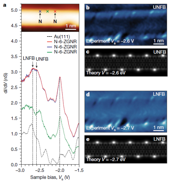 圖5 a,解耦N-6- ZGNR在圖中兩個N原子位置的Au(111)上的dI/dV點光譜,在兩個N原子之間的碳原子位置(綠色十字);Au(111)參考光譜(黑色)。b,在V = 2.6 V的偏壓下,unb的恒流dI/dV圖。c,計算出在UNFB附近的偏置范圍ΔV = 200 mV內(nèi)集成的GW LDOS。d,在V = 2.7 V的電壓偏差下記錄的LNFB的恒流dI/dV圖。e,計算出在LNFB附近的偏置范圍ΔV = 200 mV內(nèi)集成的GW LDOS。
