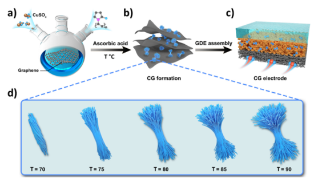 Figure 1. 用于eCO2RR 的CG電極方案。(a) 改進多元醇法合成CG;(b) 石墨烯層上的CG形成;(c) CG電極的GDE組件。(d)通過控制反應溫度從70°C到 90°C,CG 中Cu2O的形貌。